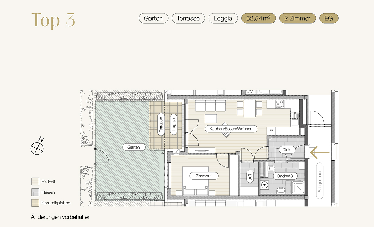Diese 2 Zimmer Wohnung bietet auf kompaktem Raum eine hohe Wohnqualität: ein Vorraum trennt den Eingangsbereich von den übrigen Räumen, hier befindet sich das kombinierte Bad mit WC, Waschmaschinenanschluss, Dusche oder Badewanne. Vom offenen Wohn-Essbereich gelangt man in einen Abstellraum und in das Schlafzimmer, dessen Fenster in den Eigengarten schaut. Eine Terrasse rundet dieses neue Zuhause ab. Garten und Terrasse sind südwestlich ausgerichtet.