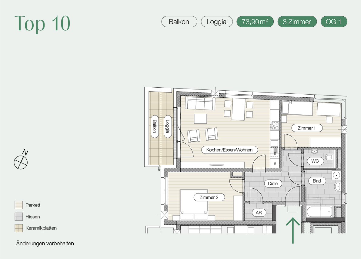 Mit einer Wohnfläche von ca. 73m2 gliedert sich diese 3 Zimmer Wohnung in eine großzügige Diele mit direktem Zugang zu einem Abstell-, oder Schrankraum, einem WC mit Handwaschbecken und einem Bad mit Waschmaschinenanschluss, Dusche oder Badewanne. Weiters gelangt man von der Diele aus in zwei Zimmer und in den großen Wohn-Ess-Bereich, der sich auf den südwestlich ausgerichteten Balkon öffnet.