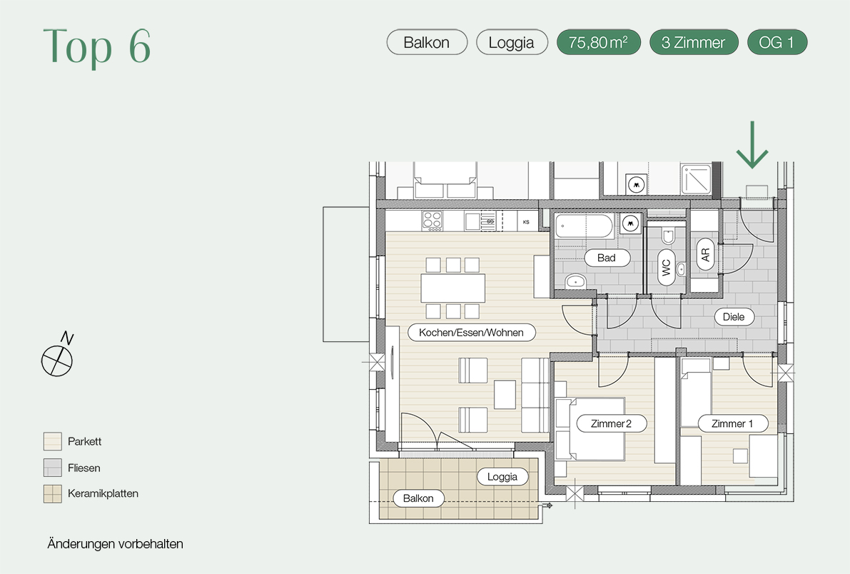 Mit einer Wohnfläche von ca. 75m2 gliedert sich diese 3 Zimmer Wohnung in eine großzügige Diele mit direktem Zugang zu einem Abstell-, oder Schrankraum, einem WC mit Handwaschbecken und einem Bad mit Waschmaschinenanschluss, Dusche oder Badewanne. Weiters gelangt man von der Diele aus in zwei Zimmer und in den großen Wohn-Ess-Bereich, der sich auf den südlich ausgerichteten Balkon öffnet.