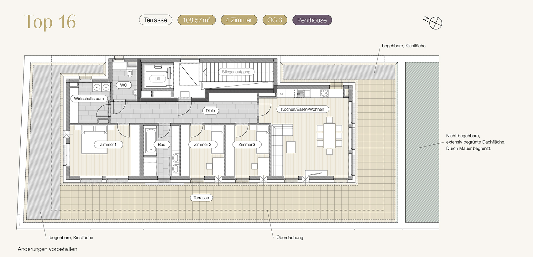 Das Penthouse der Laudonstraße Nr. 1 ist etwas Besonderes: ein gesamtes Stockwerk, bietet dieser großzügig gestalteten Wohnung Platz. Drei Zimmer, sowie ein großer Wohn- und Essbereich sind südwestlich ausgerichtet und öffnen sich auf die vorgelagerte Terrasse mit Überdachung. Ein großzügiges Badezimmer mit Dusche und Badewanne, sowie ein separates WC mit Handwaschbecken und ein eigener Wirtschaftsraum machen aus dieser Wohnung ein exklusives Zuhause.
