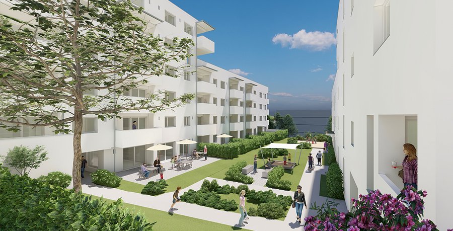 Zu jeder Einheit gehört ein Tiefgaragenplatz, zusätzliche Besucherparkplätze stehen im Freien bereit.